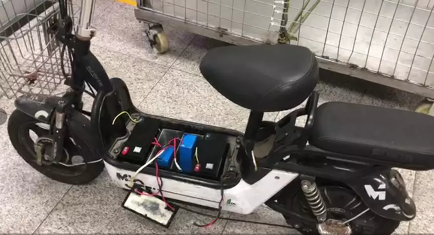 “當時看到這名旅客電單車的腳踏板位置比車身其他位置要干凈一些、新一些,就進行了檢查。檢查發(fā)現(xiàn)腳踏板可以直接掀起來,里面的電池盒外表也比較新,這就不太正常了。”現(xiàn)場關員介紹道。隨后,關員對電動單車電池盒進行了拆卸。