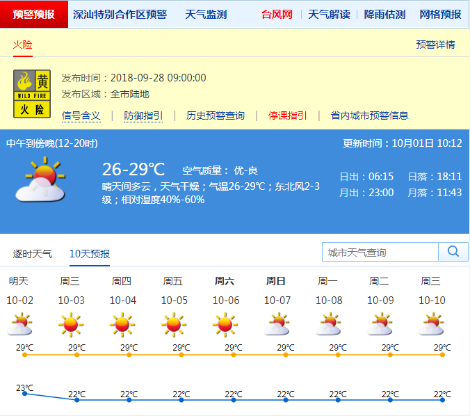 今天是長假第一天,我市白天晴到多云,早晚最低氣溫徘徊在23℃左右,中午前后最高氣溫升至29℃,天氣舒適。東北風2~3級,最小相對濕度50%,最大相對濕度80%,天氣干燥,注意補充水分。