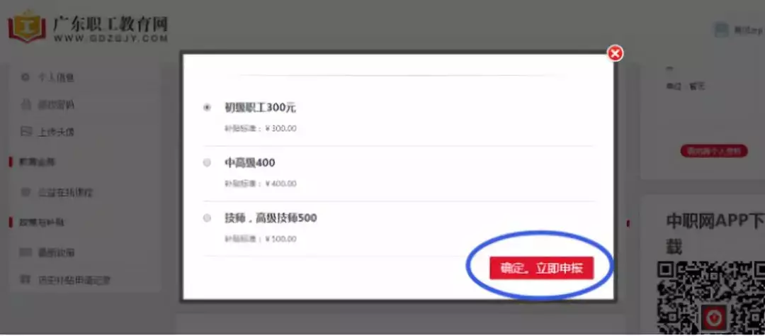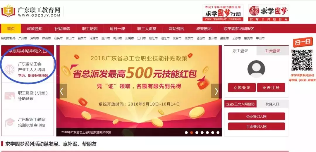 在網(wǎng)站(www.gdzgjy.com)首頁左側(cè)【申報與補貼申領入口】,點擊“廣東省總工會產(chǎn)業(yè)工人大培訓學歷、職業(yè)補貼申領”界面,選擇右側(cè)“職業(yè)技能提升補助”點擊【進入申領】。