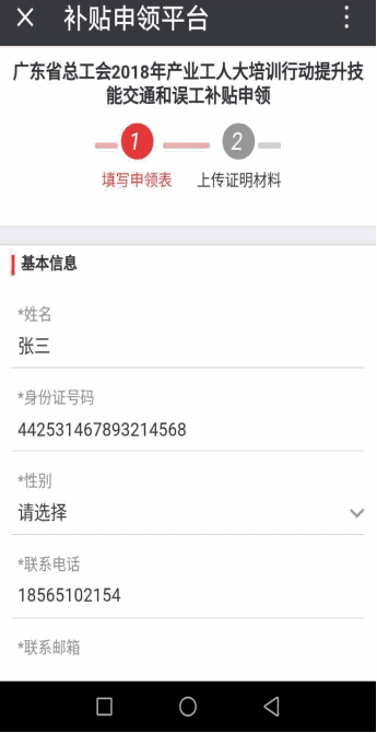 1.新注冊職工必須填寫完整信息--點擊提交資料--完成注冊,系統(tǒng)自動跳轉(zhuǎn)領取補貼頁面;
