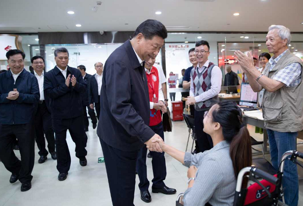 24日上午,社區(qū)居民張瑩瑩正在社區(qū)圖書館查閱資料,習近平總書記向她走來,與她親切交流。張瑩瑩5歲的時候因為小兒麻痹癥落下了腿疾,行動不便。她告訴總書記,社區(qū)有300多名殘疾人士,這里有專門為殘疾居民設(shè)計的戶型。