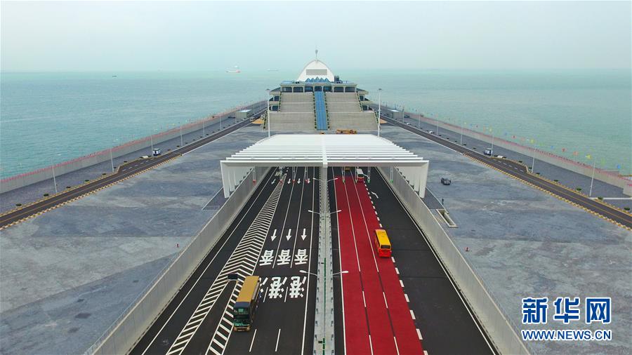 10月24日,來往車輛在東人工島上出入海底隧道(無人機拍攝)。當日,港珠澳大橋正式通車。(新華社記者梁旭攝)