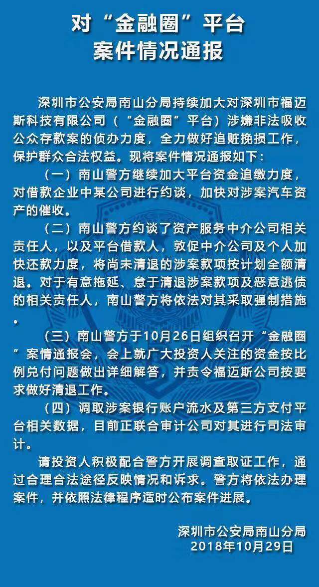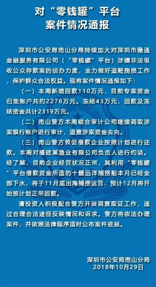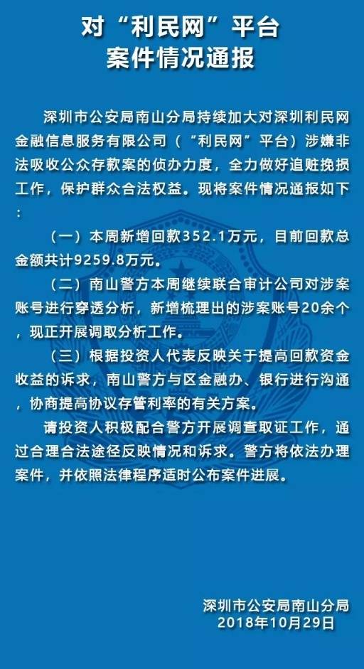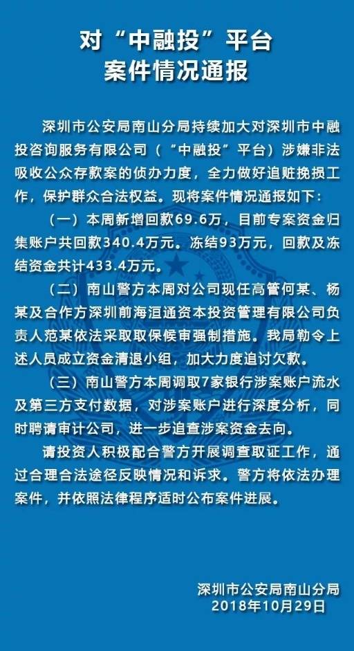 10月29日,深圳南山公安通報五家涉嫌非法集資犯罪的P2P平臺案件情況。五家平臺分別是“中融投”“投之家”“零錢罐”“利民網(wǎng)”“金融圈”平臺。