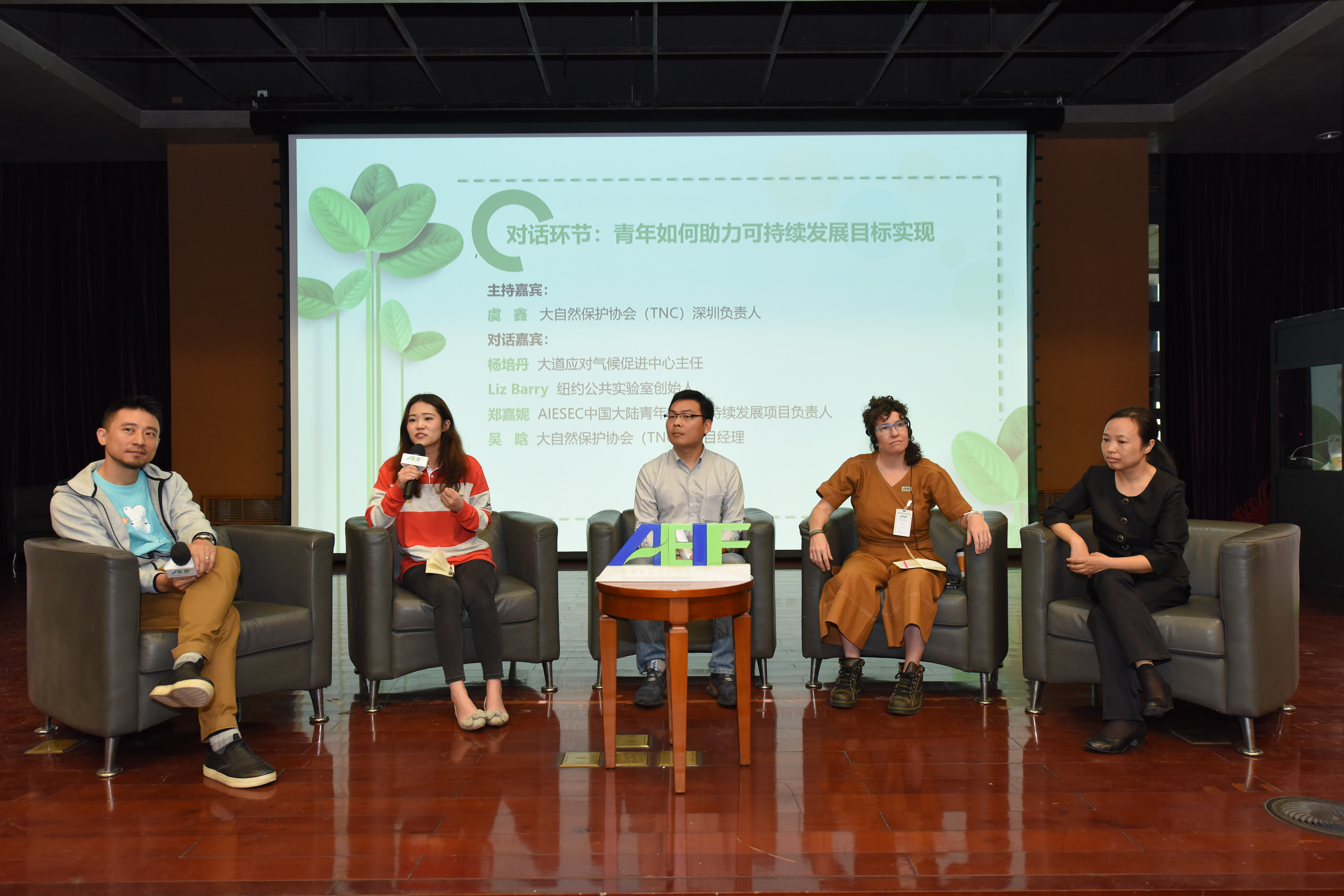 對(duì)話(huà)環(huán)節(jié)“青年如何助力可持續(xù)發(fā)展目標(biāo)實(shí)現(xiàn)”共有6位嘉賓參與。在主持嘉賓大自然保護(hù)協(xié)會(huì)(TNC)深圳保護(hù)項(xiàng)目負(fù)責(zé)人虞鑫先生的帶領(lǐng)下,大道應(yīng)對(duì)氣侯促進(jìn)中心主任楊培丹、紐約公共實(shí)驗(yàn)室創(chuàng)始人Liz Barry、AIESEC中國(guó)大陸青年獻(xiàn)力可持續(xù)發(fā)展項(xiàng)目負(fù)責(zé)人鄭嘉妮、大自然保護(hù)協(xié)會(huì)(TNC)項(xiàng)目經(jīng)理吳晗參與了分享交流。