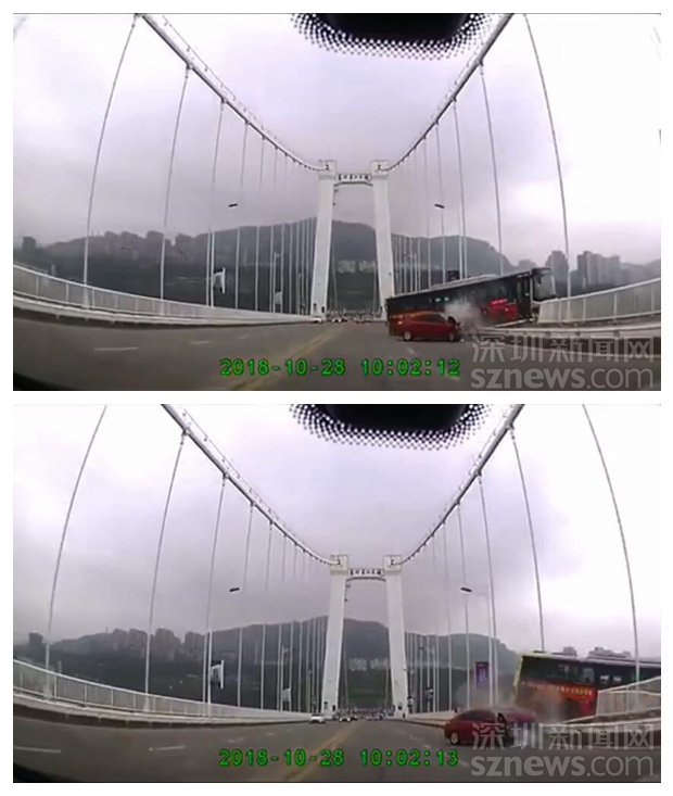重慶22路公交墜江瞬間視頻截圖來自事發(fā)時(shí)路過大橋的小汽車行車記錄儀