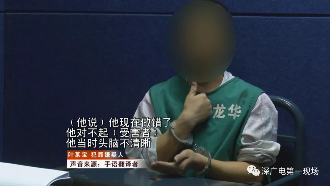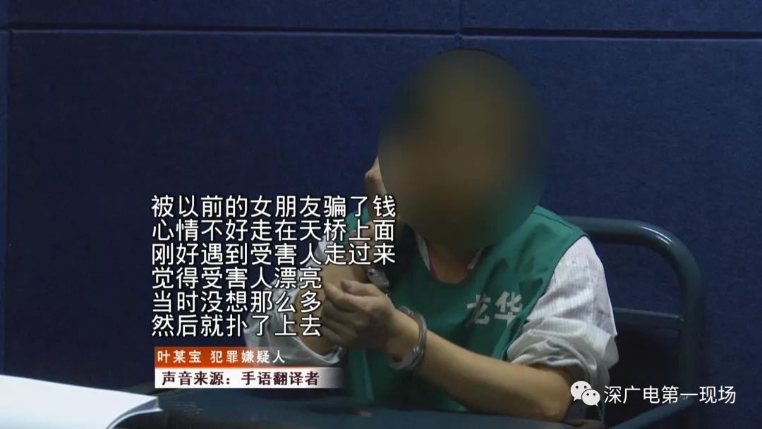 今天上午,記者在龍華油松派出所,見到了犯罪嫌疑人葉某寶。葉某寶是安徽人,今年31歲,在龍華區(qū)某工廠工作。在采訪時(shí),記者發(fā)現(xiàn),犯罪嫌疑人葉某寶是名聽障人士,通過(guò)手語(yǔ)交談后了解到,11月2號(hào)晚上七點(diǎn)多,他途經(jīng)建設(shè)東路人行天橋時(shí),對(duì)小王起了“歹心”。