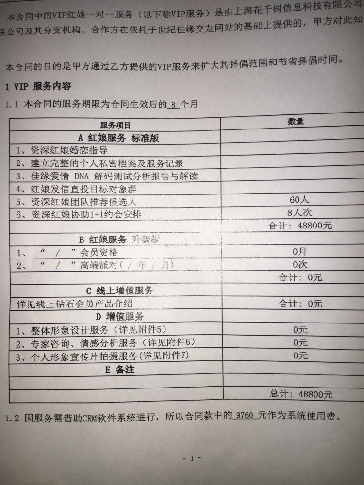今年2月27日,劉小姐與世紀(jì)佳緣簽訂了一份繳款4.88萬(wàn)的紅娘服務(wù)合同。合同服務(wù)期限為8個(gè)月,合同將根據(jù)其擇偶標(biāo)準(zhǔn),由系統(tǒng)推薦60位候選人,其中紅娘協(xié)助線下約會(huì)安排8人次。此外,合同還包含三項(xiàng)增值服務(wù),包括整體形象設(shè)計(jì),專(zhuān)家咨詢、情感分析服務(wù)和個(gè)人宣傳片服務(wù)。