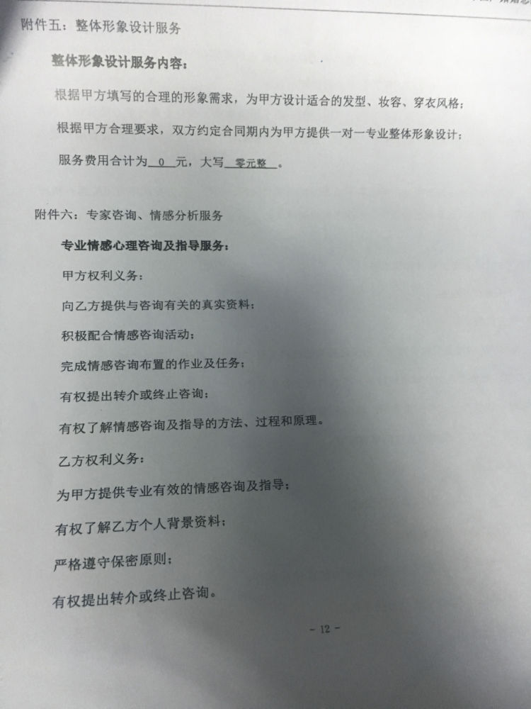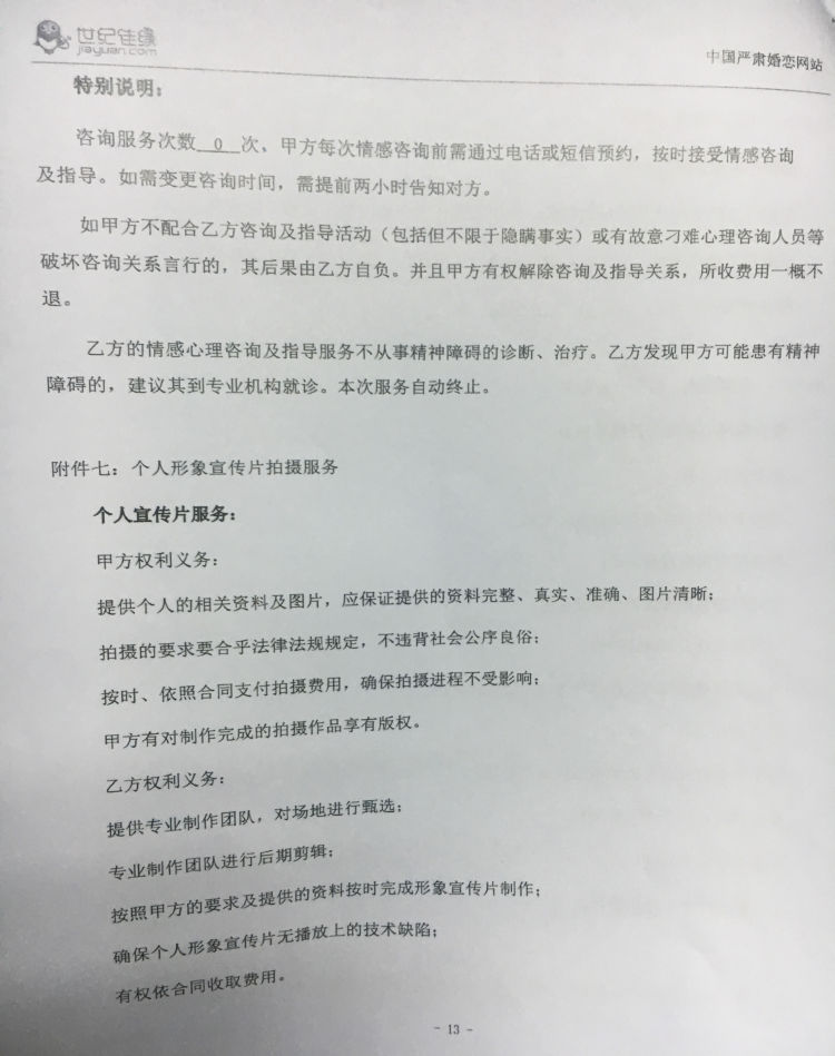 根據(jù)合同,目前服務(wù)時間已經(jīng)終止,但還有心理咨詢服務(wù)及個人宣傳片兩項增值服務(wù)未履行。朱女士對此解釋,這是屬于不收費的增值服務(wù),需要客戶自己提出才會進(jìn)行?!皼]有人跟我說過這個需要自己提出要求。”劉小姐對該說法并不買賬。