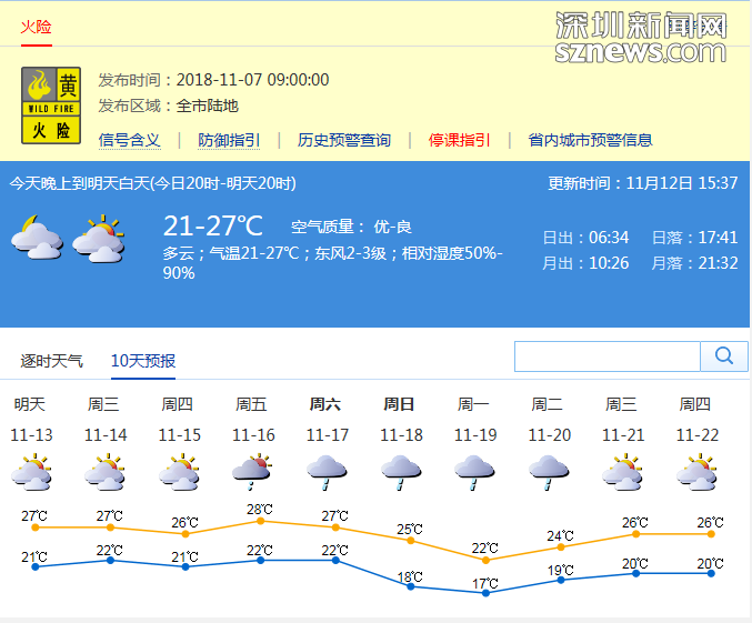 記者從深圳市氣象局了解到,11日夜間到12日白天,深圳市多云間陰天;早晨最低氣溫22-23℃,東部及山地地區(qū)氣溫會低1-2℃;白天最高氣溫在28-30℃;相對濕度在45%-95%;偏北風(fēng)2-3級,沿海和高地最大陣風(fēng)4-5級;全市能見度普遍在5-15公里左右?;痣U(xiǎn)預(yù)警信號生效中。