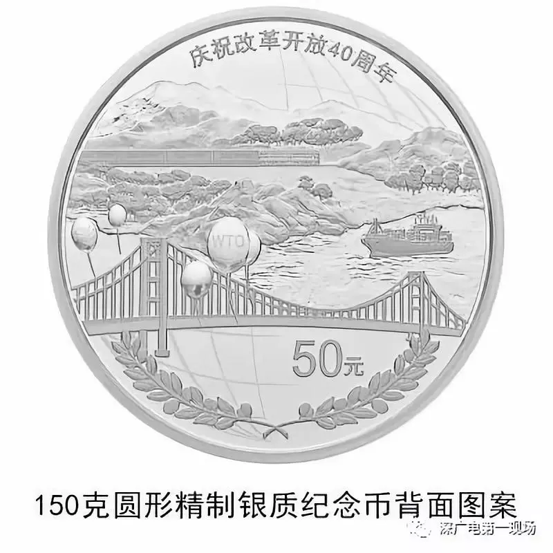 背面圖案為象征“一帶一路”的陸地、海洋、橋梁、橄欖枝等裝飾組合設計,并刊“慶祝改革開放40周年”字樣及面額。