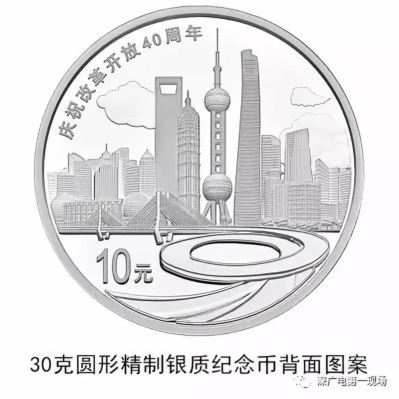 30克圓形銀質紀念幣背面圖案之二為深圳城市建筑、蛇口港、拓荒牛雕塑及飄帶等組合設計,并刊“慶祝改革開放40周年”字樣及面額。