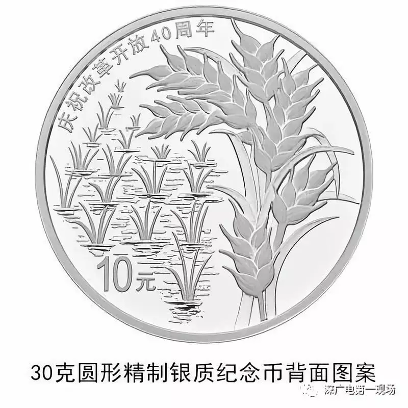 30克圓形銀質紀念幣背面圖案之一為象征農村改革啟始(安徽小崗村)的禾苗和稻穗,并刊“慶祝改革開放40周年”字樣及面額。