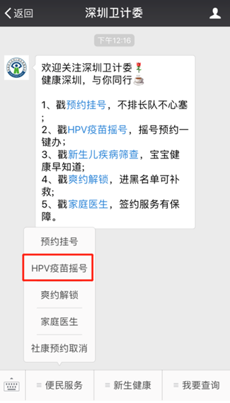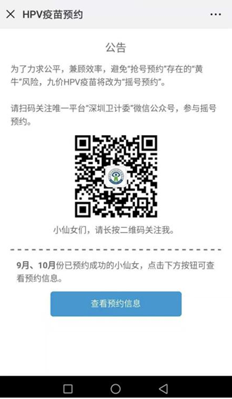 11月19日,深圳衛(wèi)計委上線了九價HPV疫苗搖號系統(tǒng),“深圳衛(wèi)計委”微信公眾號為官方認(rèn)證的唯一搖號平臺。進入“深圳衛(wèi)計委”-菜單欄“便民服務(wù)”-“HPV疫苗搖號”系統(tǒng),可以一站式“注冊-搖號-預(yù)約”。