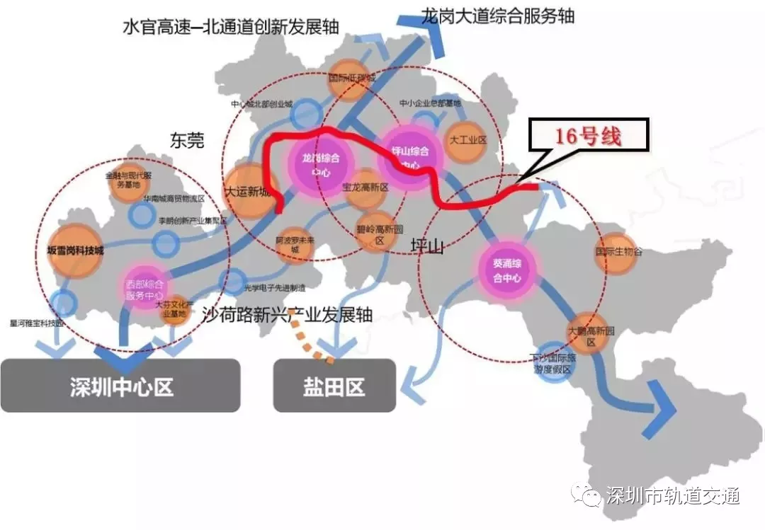 深圳地鐵16號線聯(lián)系大運(yùn)新城、龍崗中心城、坪山站及坪山新區(qū)等地區(qū),是東部組團(tuán)內(nèi)部的軌道線路。線路全長約29.2公里,設(shè)站24座。線路由大運(yùn)站引出,沿龍崗大道、黃閣路、龍平路敷設(shè),經(jīng)龍崗老中心后沿深汕公路往南至坪山站,經(jīng)坪山中心區(qū)后沿東縱路、金田路等路敷設(shè)至終點(diǎn)田心。地鐵的建設(shè)不管在經(jīng)濟(jì)上還是民生方面對整體坪山區(qū)的發(fā)展意義重大。