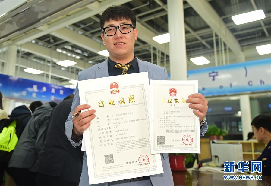 在沈陽片區(qū)政務(wù)服務(wù)中心,一位企業(yè)代表注冊當(dāng)天拿到了營業(yè)執(zhí)照(2017年4月10日攝)。