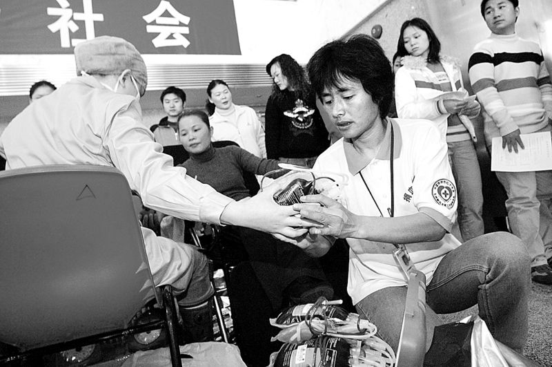 2006年,深圳獻血女狀元高敏在捐血現(xiàn)場協(xié)助醫(yī)生工作。 記者 許業(yè)周 攝