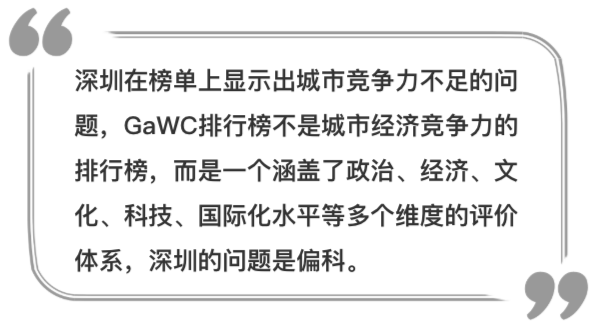 從GaWC發(fā)布的榜單和評(píng)價(jià)體系可以看出,深圳雖然在經(jīng)濟(jì)實(shí)力和經(jīng)濟(jì)總量上已經(jīng)取得了較大發(fā)展,但城市國(guó)際綜合競(jìng)爭(zhēng)力尤其是城市軟實(shí)力還存在明顯差距,“偏科”的現(xiàn)象仍然沒(méi)有改變。