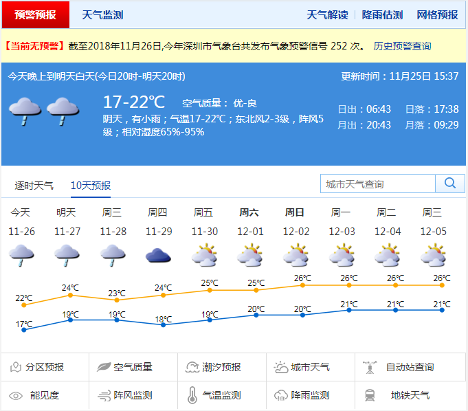 深圳新聞網(wǎng)11月26日訊(記者 施冰冰) 記者從深圳市氣象臺(tái)了解到今天陰天,間中有小雨,氣溫17℃-22℃;周二到周四以陰天為主,間中有分散小雨;周五到周日多云,可見(jiàn)陽(yáng)光,氣溫回升。