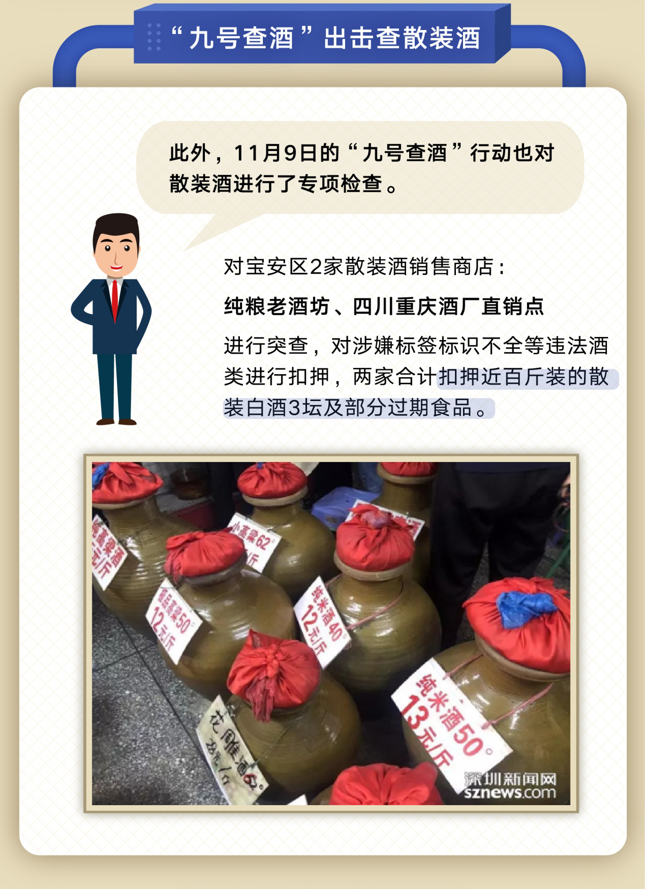 此外,在11月9日的“九號(hào)查酒”行動(dòng)中,也對(duì)散裝酒進(jìn)行了專(zhuān)項(xiàng)檢查,對(duì)寶安區(qū)的2家散裝酒銷(xiāo)售商店:純糧老酒坊、四川重慶酒廠直銷(xiāo)點(diǎn)進(jìn)行了突查,對(duì)涉嫌違法酒類(lèi)進(jìn)行扣押,兩家合計(jì)扣押近百斤裝的散裝白酒3壇及部分過(guò)期食品。