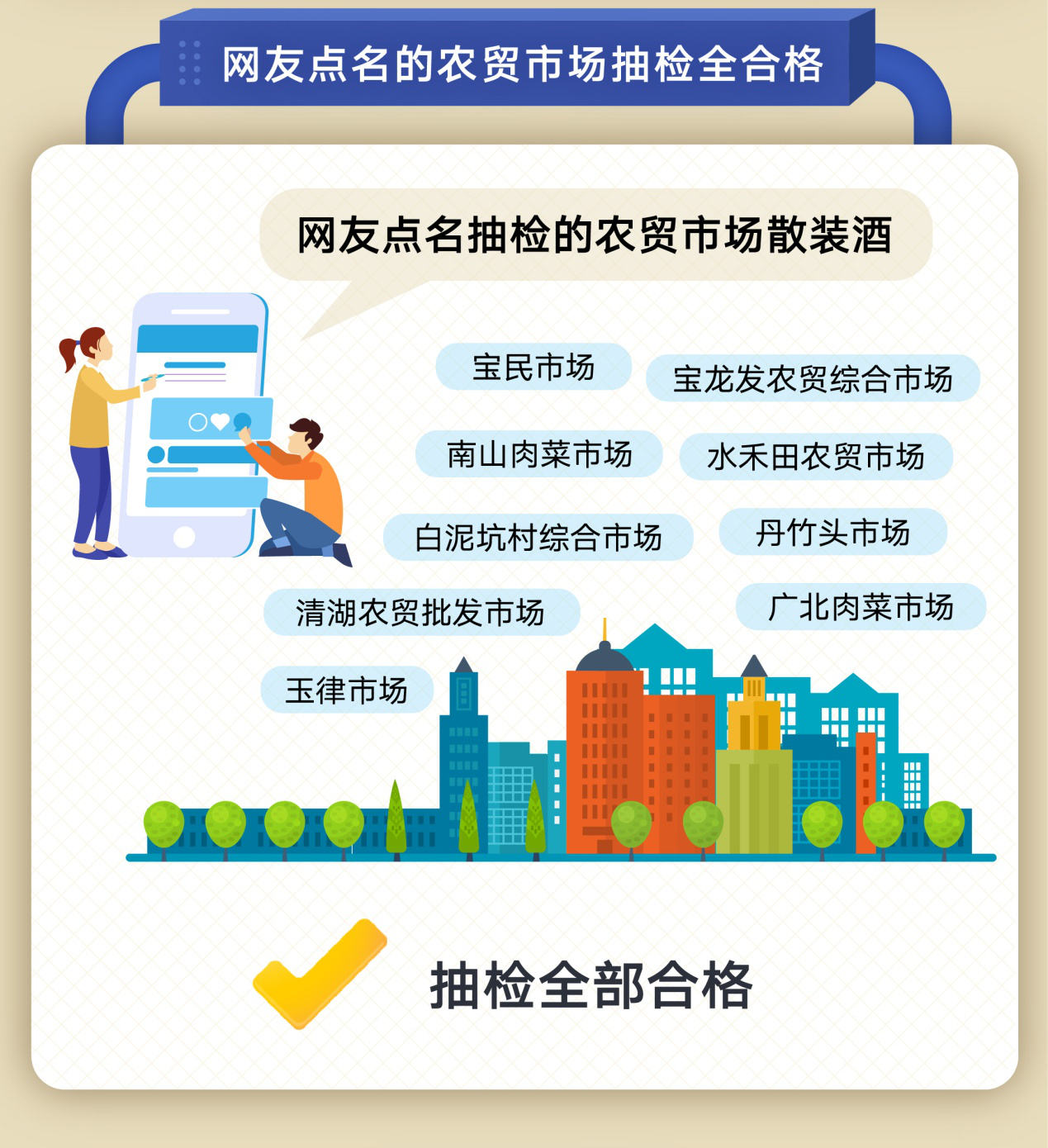 另外,根據(jù)網(wǎng)友點(diǎn)名,抽檢了這些農(nóng)貿(mào)市場(chǎng)的商行散裝酒:寶民市場(chǎng)、寶龍發(fā)農(nóng)貿(mào)綜合市場(chǎng)、南山肉菜市場(chǎng)、水禾田農(nóng)貿(mào)市場(chǎng)、白泥坑村綜合市場(chǎng)、丹竹頭市場(chǎng)、廣北肉菜市場(chǎng)、清湖農(nóng)貿(mào)批發(fā)市場(chǎng)、玉律市場(chǎng)等,全部合格。