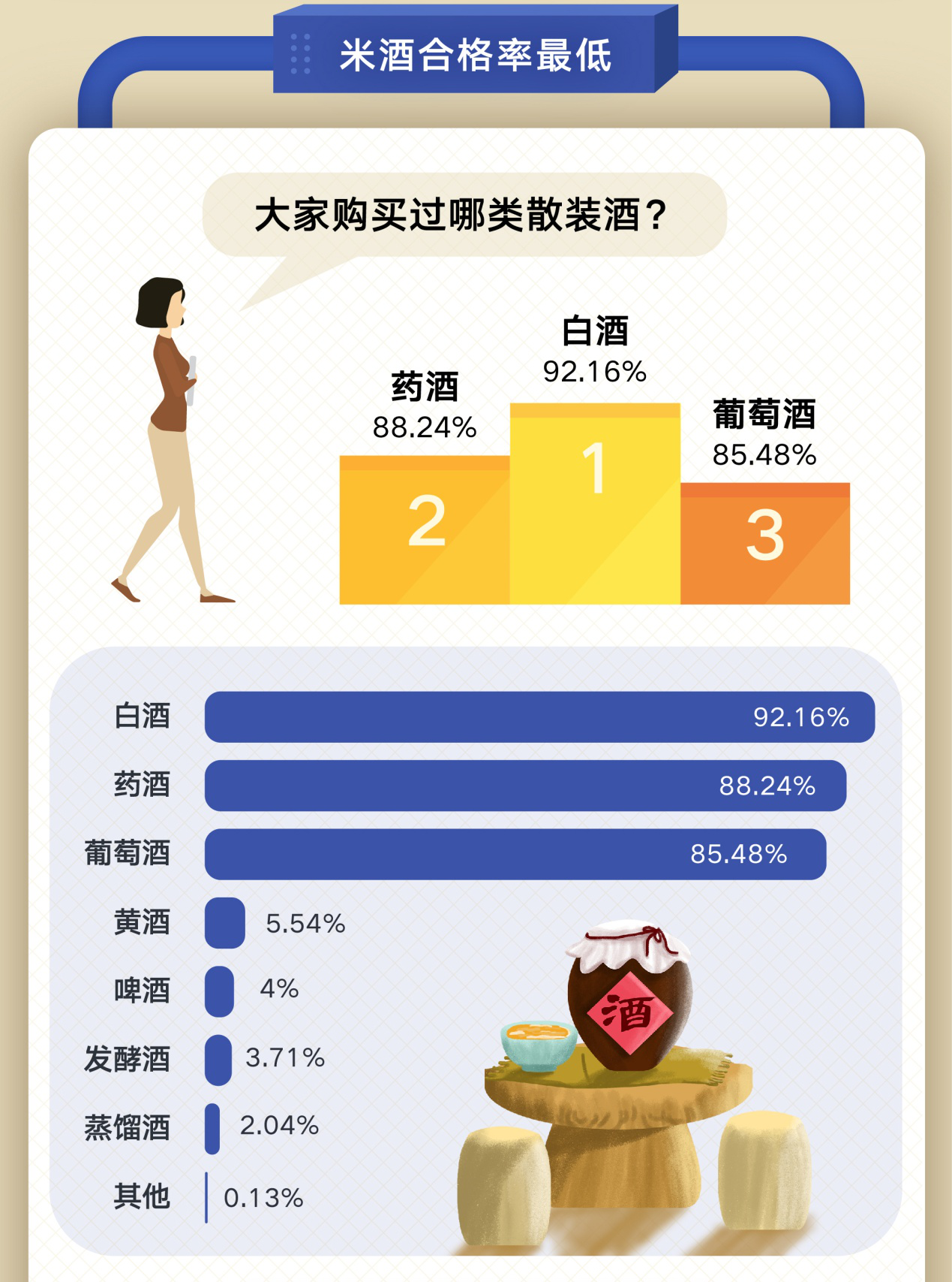 根據(jù)投票結(jié)果,此次共抽檢各類(lèi)散裝酒143批次,11批次不合格,合格率92.3%。其中,抽檢白酒23批次,合格率100%;抽檢高粱酒60批次,5批次不合格,合格率91.67%;抽檢米酒51批次,不合格6批次,合格率88.2%。