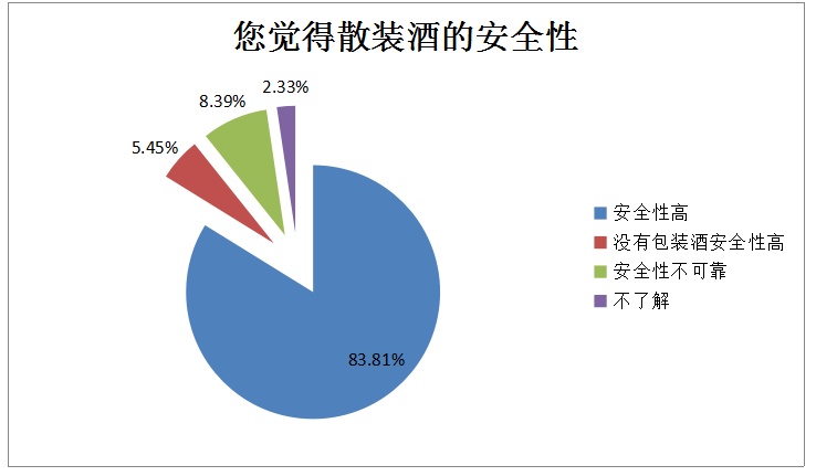 深圳人對(duì)散裝酒安全性的評(píng)價(jià)如何?83.81%的網(wǎng)民還是認(rèn)為安全性高;只有8.39%的網(wǎng)民和5.45%的網(wǎng)民認(rèn)為安全性不可靠、沒有包裝酒安全性高。
