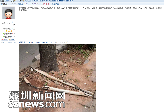網(wǎng)友“syq123”發(fā)帖:臺(tái)風(fēng)過(guò)后,幾個(gè)月了過(guò)去了,電線(xiàn)還暴露在外面,坐標(biāo)布吉