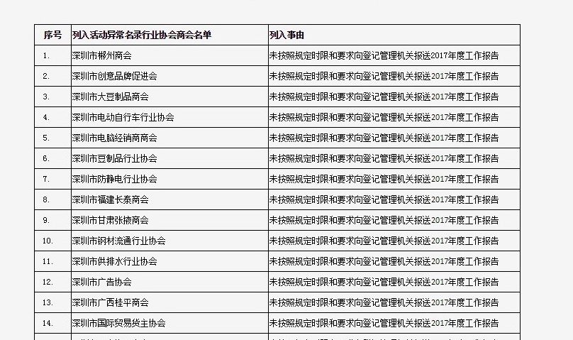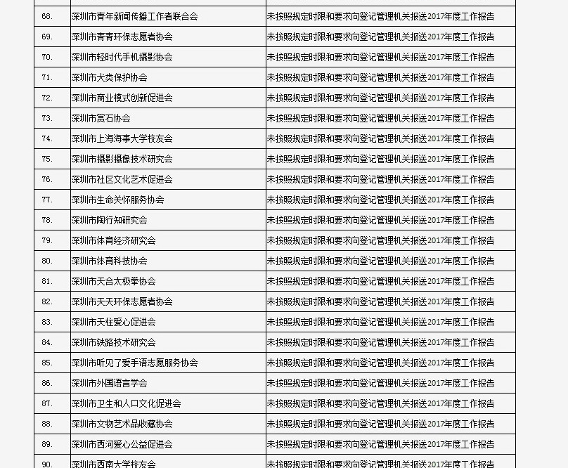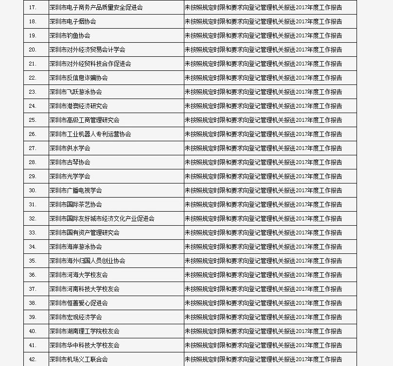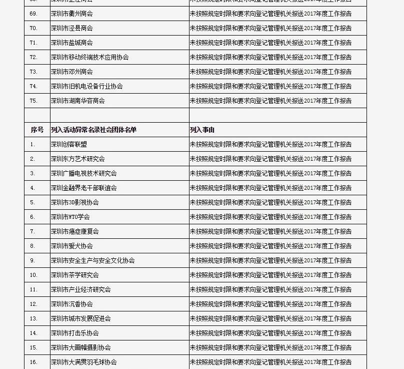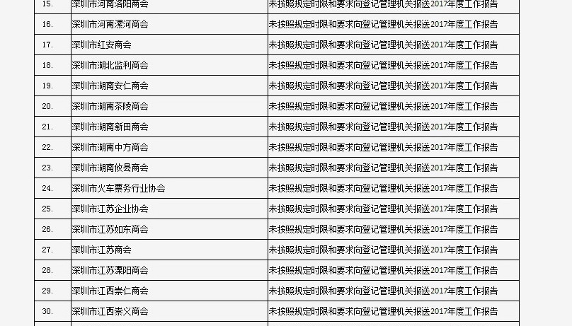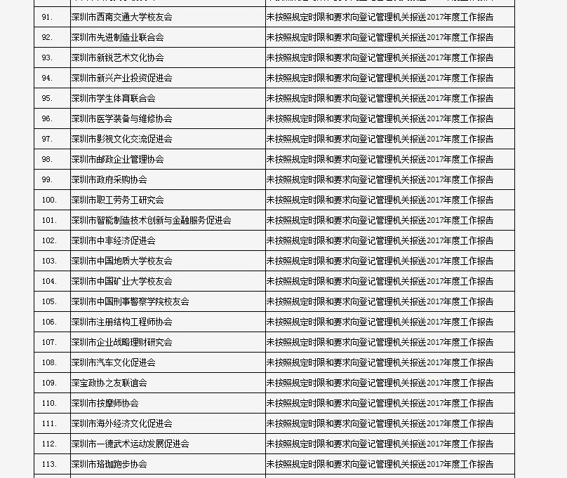 據(jù)深圳市民政局通報,深圳市華中科技大學校友會和深圳市深圳大學校友會等121家社會團體、深圳市郴州商會等75家行業(yè)協(xié)會商會、企業(yè)家與企業(yè)管理研究院(中國·深圳)等201家民辦非企業(yè)單位、深圳市明園慈善基金會等20家基金會,經(jīng)查“未按照規(guī)定時限和要求向登記管理機關(guān)報送2017年度工作報告”,違反了《社會組織信用信息管理辦法》《深圳經(jīng)濟特區(qū)行業(yè)協(xié)會條例》的相關(guān)規(guī)定,被列入活動異常名錄名單。完整版名單已在“深圳民政在線”公布。