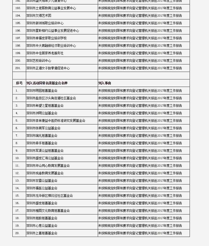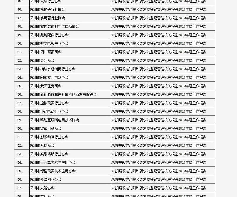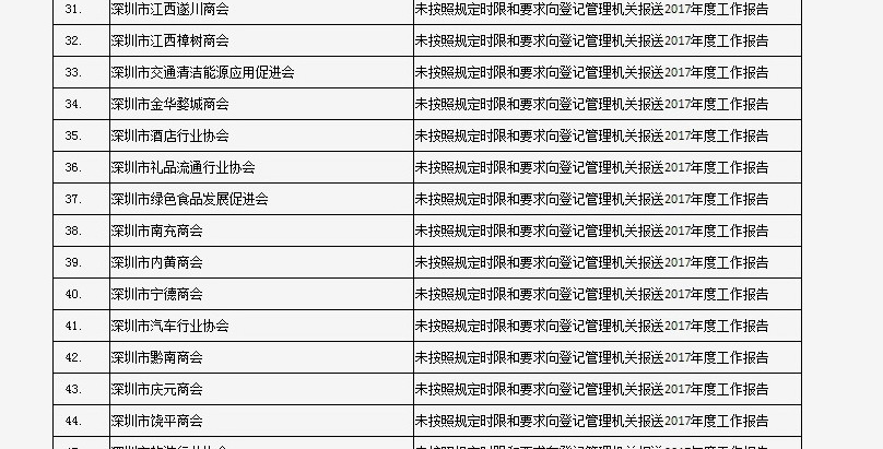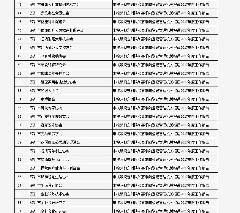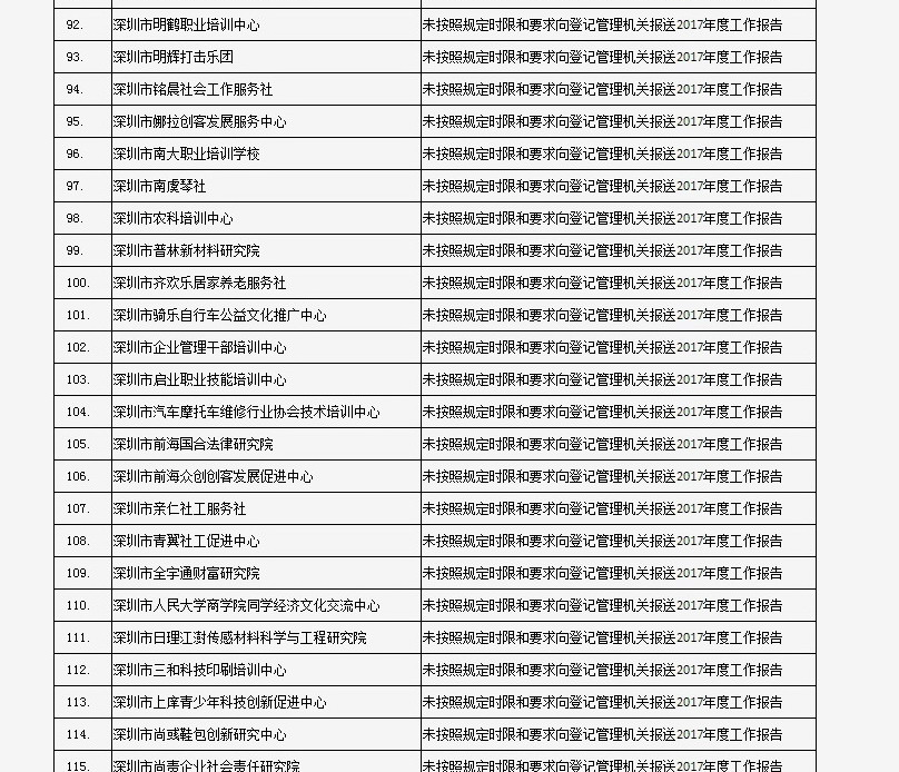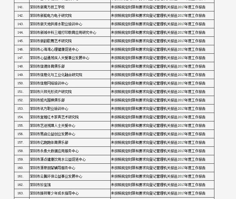 據(jù)深圳市民政局通報,深圳市華中科技大學校友會和深圳市深圳大學校友會等121家社會團體、深圳市郴州商會等75家行業(yè)協(xié)會商會、企業(yè)家與企業(yè)管理研究院(中國·深圳)等201家民辦非企業(yè)單位、深圳市明園慈善基金會等20家基金會,經(jīng)查“未按照規(guī)定時限和要求向登記管理機關(guān)報送2017年度工作報告”,違反了《社會組織信用信息管理辦法》《深圳經(jīng)濟特區(qū)行業(yè)協(xié)會條例》的相關(guān)規(guī)定,被列入活動異常名錄名單。完整版名單已在“深圳民政在線”公布。