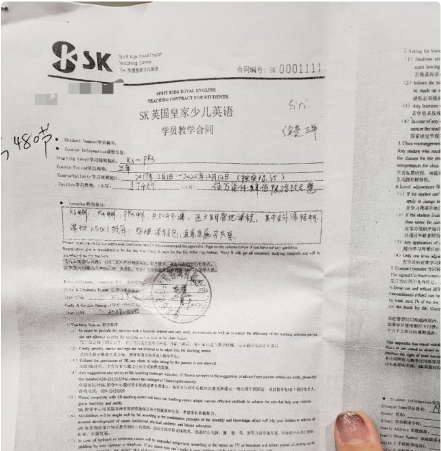 12月2日,家住福田區(qū)的徐先生照常把孩子帶到香蜜湖1979文化創(chuàng)意園的"SK英國皇家少兒英語"上課,沒想到到了課堂卻收到一紙停課通知。工作人員告訴徐先生,由于經(jīng)營不善,機構(gòu)老板決定停止授課,家長們要提供當(dāng)初簽訂的合同和收據(jù)辦理退款,但是在2018年3月1日前交學(xué)費的家長不能退款。