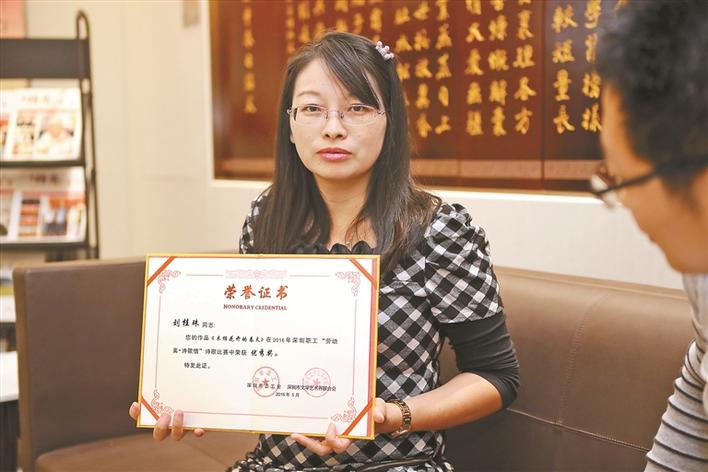 “近期,我剛剛加入了深圳市福田區(qū)作家協(xié)會?!眲⒐鹬楦嬖V記者,她從高中的時候就喜歡寫作。“后來,我來深圳打工之后,不管工作多忙多累,這個愛好都沒有間斷過,一直堅持到現(xiàn)在。它已經成為我生命中的一部分了,可以說是一種生活習慣?!?/p>