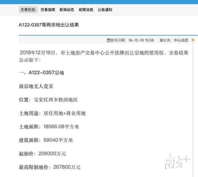 記者12月19日查閱深圳市土地房產(chǎn)交易中心官網(wǎng)信息顯示,A122—0357宗地出讓結(jié)果為無人競(jìng)買。