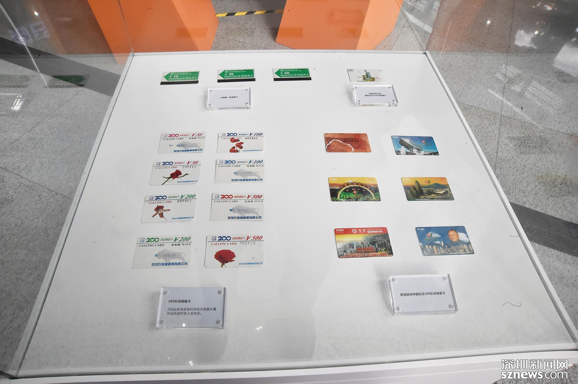 卡類專區(qū)分別展示了全國第一套綠箭卡(左上),信息樞紐大廈奠基紀(jì)念200長話儲值卡(右上),200長話儲值卡(左下)以及香港回歸中國紀(jì)念200長話儲值卡(右下)。