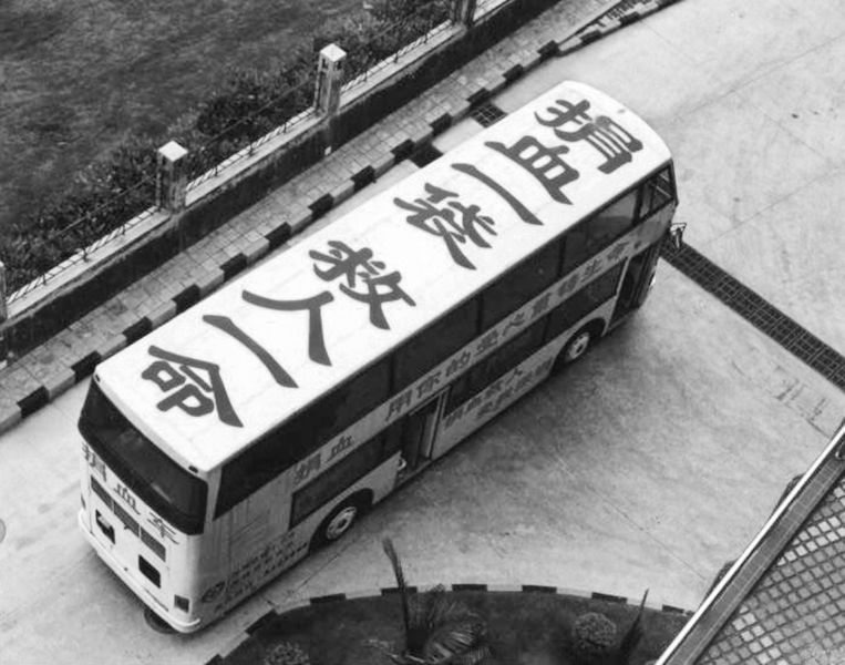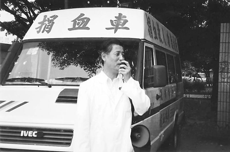 1995年5月7日,捐血車第一天開上街頭,血站老站長楊春森拿著擴音器大嗽叭向市民宣傳。余海蓉攝