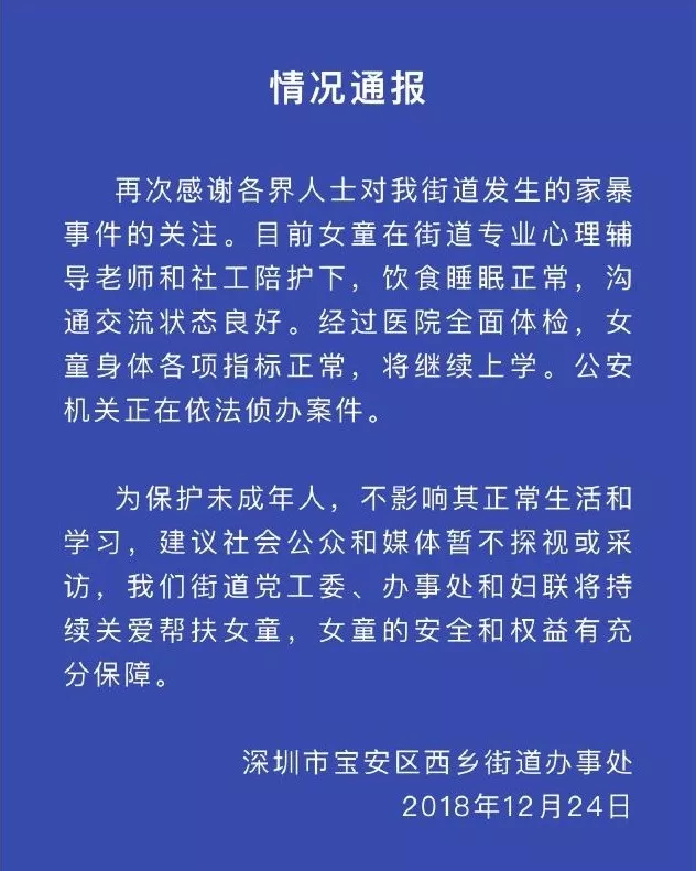 12月23日,深圳警方關(guān)注并調(diào)查此事。隨后深圳市寶安區(qū)委宣傳部官方微博@陽(yáng)光寶安發(fā)布通報(bào)稱,女童父母對(duì)毆打女童的事實(shí)供認(rèn)不諱。寶安區(qū)婦聯(lián)已向法院申請(qǐng)女童人身安全保護(hù)令。