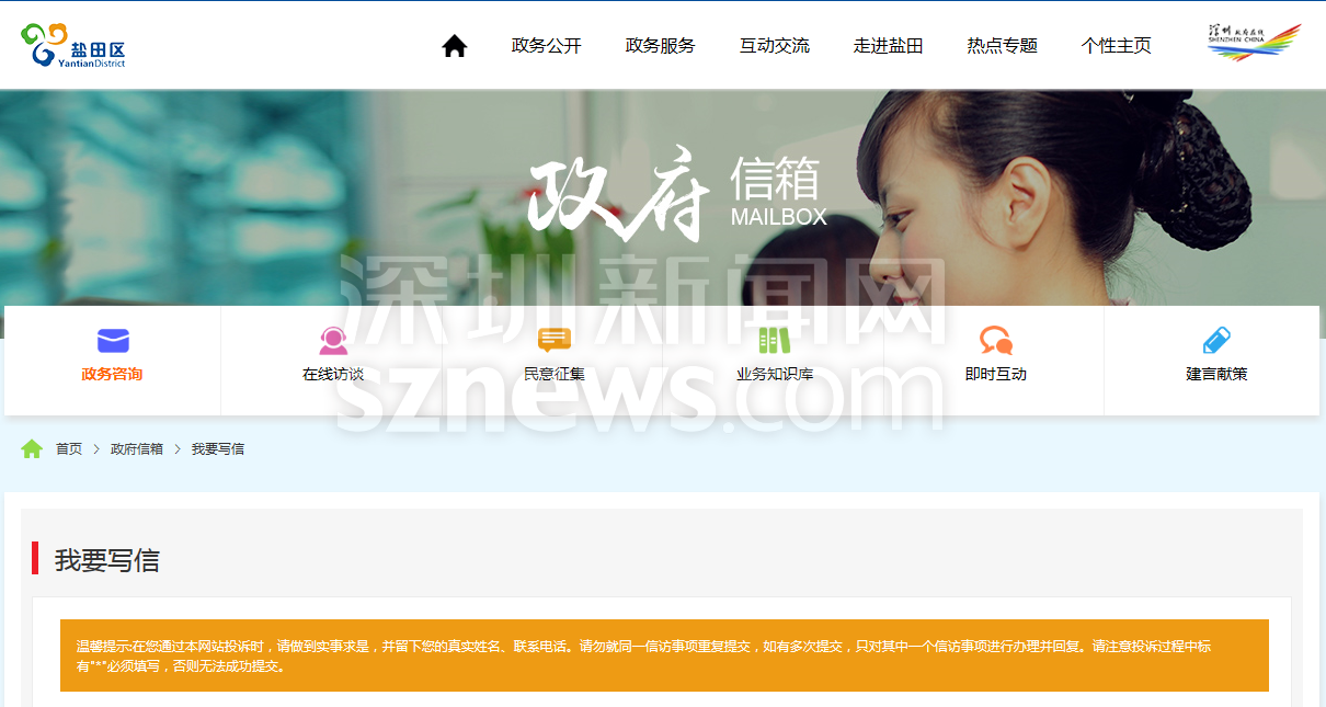 記者通過鹽田政府在線網站的信訪渠道寫信反饋情況,顯示提交成功