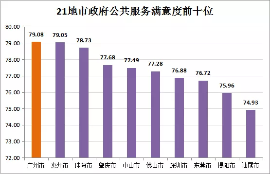 在調(diào)查的122個縣(市、區(qū))中,越秀區(qū)政府公共服務(wù)總體滿意度最高(83.95分),連續(xù)五年在縣(市、區(qū))評價中居首;隨后依次為:天河區(qū)、惠城區(qū)、端州區(qū)、光明區(qū)、南山區(qū)、斗門區(qū)、從化區(qū)、南沙區(qū)、順德區(qū),居前十位的均處于珠三角地區(qū),是我省公共服務(wù)建設(shè)標(biāo)桿地區(qū)。