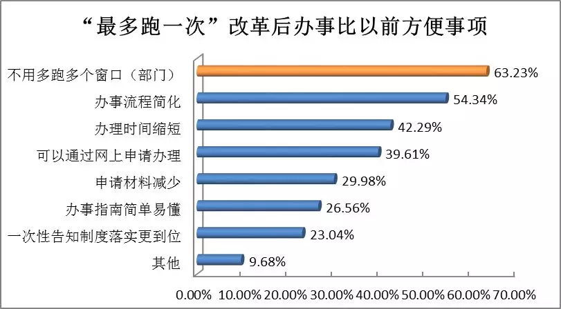 86.69%的受訪者認(rèn)為“最多跑一次”改革實施后到政府辦事比以前更方便了,方便事項排在第一位的是“不用多跑多個窗口(63.23%),其次依次為辦事流程簡化(54.34%)、辦理時間縮短(42.29%)。