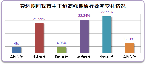 經(jīng)對我市城區(qū)主干道高峰期車流量監(jiān)測,預(yù)計春運期間我市早晚高峰道路日趨順暢,全市各條主干道及進出關(guān)道路平均通行效率提高一成,北環(huán)東行、泥崗路西行行車效率提升最為明顯。