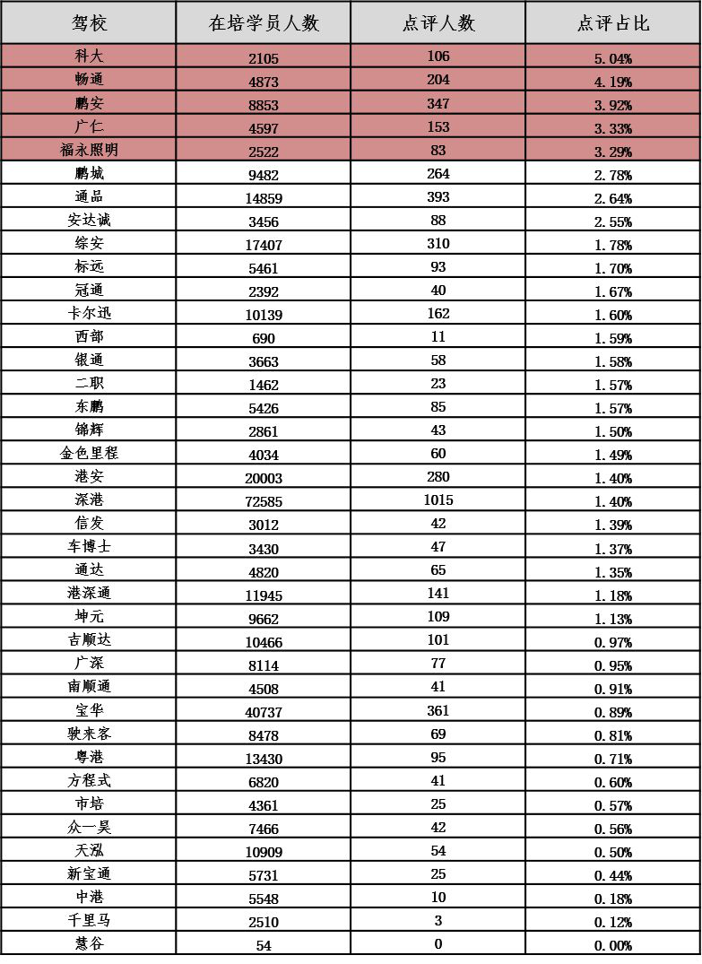 第四季度教練員點(diǎn)評(píng)占比最高的前5名駕校分別為:科大、暢通、鵬安、廣仁、福永照明。