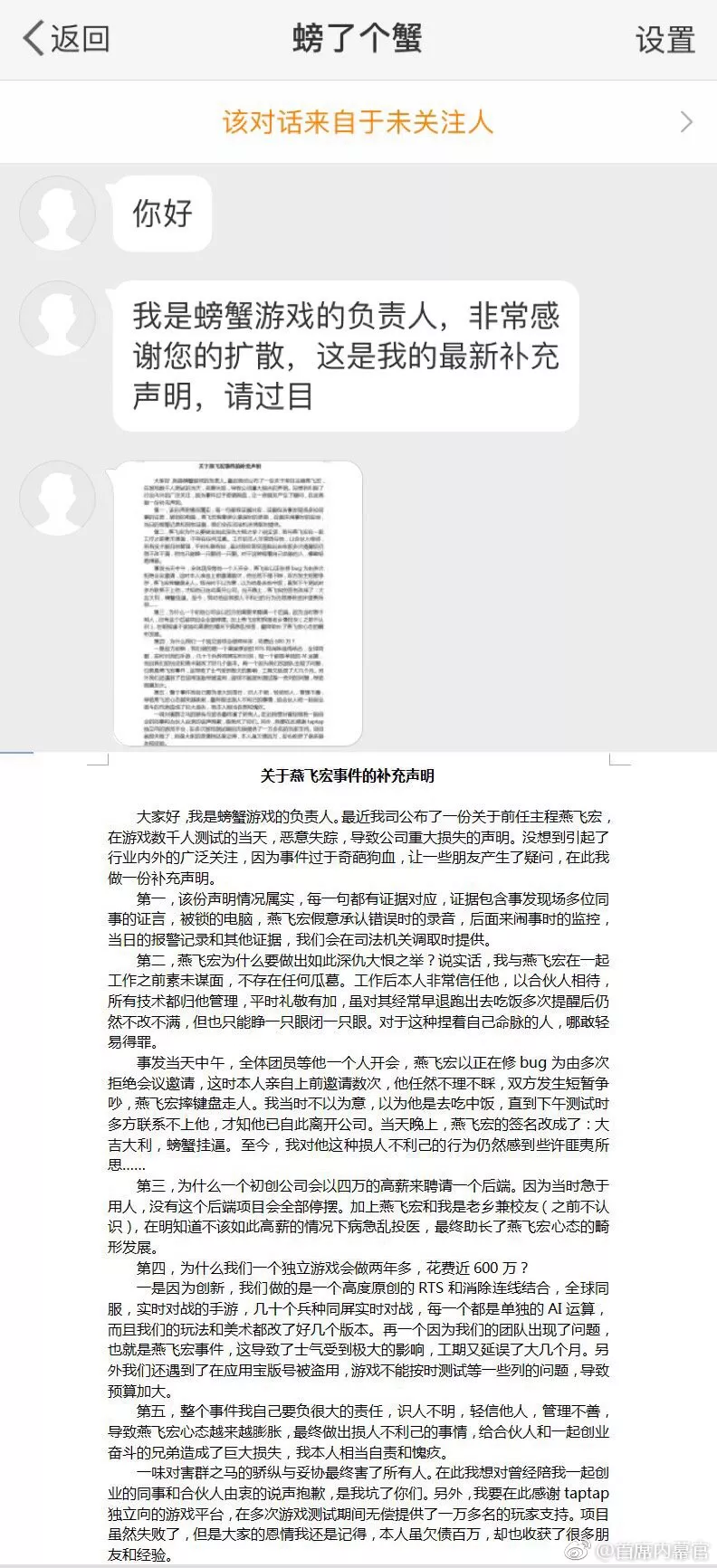 該微博一同曝光的還有一份“關(guān)于燕飛宏的補(bǔ)充聲明”,自稱是螃蟹游戲負(fù)責(zé)人的“螃了個蟹”表示,自己與燕飛宏在一起工作之前素未謀面,不存在任何瓜葛,工作后非常信任他,以合伙人相待,所有技術(shù)都?xì)w他管理,因為捏著公司命脈,對其經(jīng)常早退也只能睜一只眼閉一只眼。