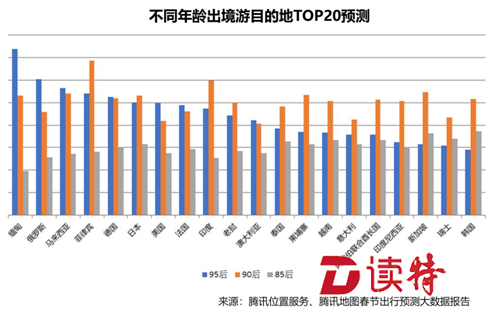 根據(jù)年齡劃分,18歲以下青少年最喜歡前往東南亞國(guó)家,而60歲以上老年人最青睞的是歐美發(fā)達(dá)國(guó)家。進(jìn)一步研究發(fā)現(xiàn),85后最愛(ài)去的國(guó)家是韓國(guó)、新加坡、瑞士、阿聯(lián)酋、越南,涵蓋東亞、東南亞和歐洲,90后最愛(ài)去的國(guó)家是菲律賓、印度、新加坡、馬來(lái)西亞、柬埔寨,全部在東南亞地區(qū),95后最愛(ài)去的國(guó)家是緬甸、俄羅斯、馬來(lái)西亞、菲律賓、德國(guó),涵蓋東南亞和歐洲。
