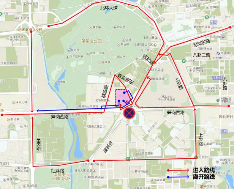 車行交通調(diào)整為:筍崗西路 -梅崗路;紅荔路 -皇崗路 -筍崗西路 -梅崗路;筍崗西路 -泥崗西路 -靜逸街(梅崗南街)。