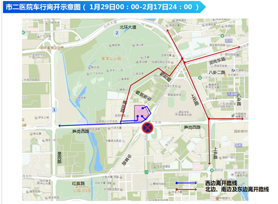 市二醫(yī)院車行離開示意圖--藍色線條為西邊離開路線,紅色線條為北邊、南邊及東邊離開路線。
