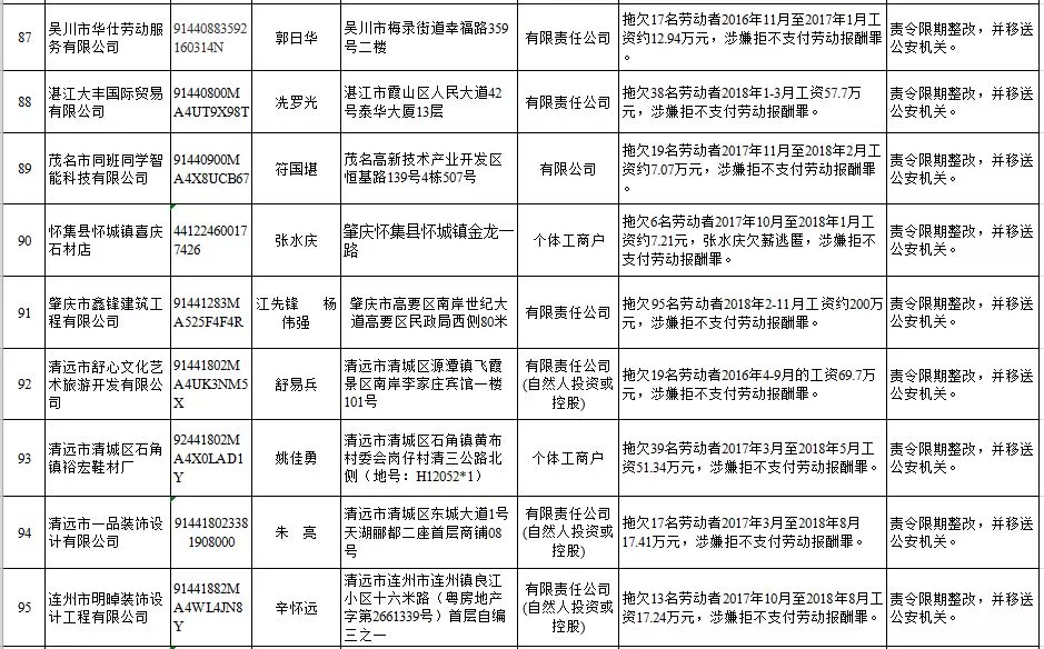 深圳新聞網(wǎng)2019年1月29日訊 (記者 劉婷)據(jù)廣東發(fā)布消息,省人社廳近日公布,2019年第一批用人單位重大勞動(dòng)保障違法行為名單。到底是哪些企業(yè)在惡意欠薪?這些“老賴”企業(yè)的營(yíng)業(yè)執(zhí)照、地址、法人等等超全信息都在這!