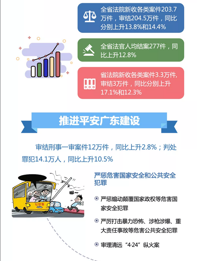 深圳新聞網(wǎng)2019年1月30日訊(記者 張玲 牛耘 發(fā)自廣州)1月30日上午,廣東省十三屆人大二次會(huì)議舉行第二次全體會(huì)議,人大、兩院報(bào)告內(nèi)容齊亮相。2018年,廣東法院做了哪些工作,交出了一份怎樣的成績單?廣東省高級(jí)人民法院院長龔稼立在廣東省高級(jí)人民法院工作報(bào)告中公布了一組數(shù)據(jù):2018年,全省法院新收各類案件203.7萬件,審結(jié)204.5萬件,同比分別上升13.8%和14.4%;法官人均結(jié)案277件,同比上升12.8%;案件再審糾錯(cuò)率1.2‰,案訪比連續(xù)下降。其中,省法院新收各類案件3.3萬件,審結(jié)3萬件,同比分別上升17.1%和12.3%。