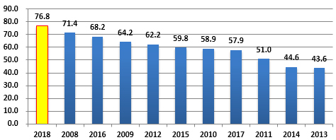 根據(jù)全市區(qū)域自動氣象站臺風風雨影響綜合年景指數(shù)計算結果,2018年臺風風雨影響綜合年景指數(shù)達到76.8,成為2008年以來最嚴重的一年,超過2008年的71.4。