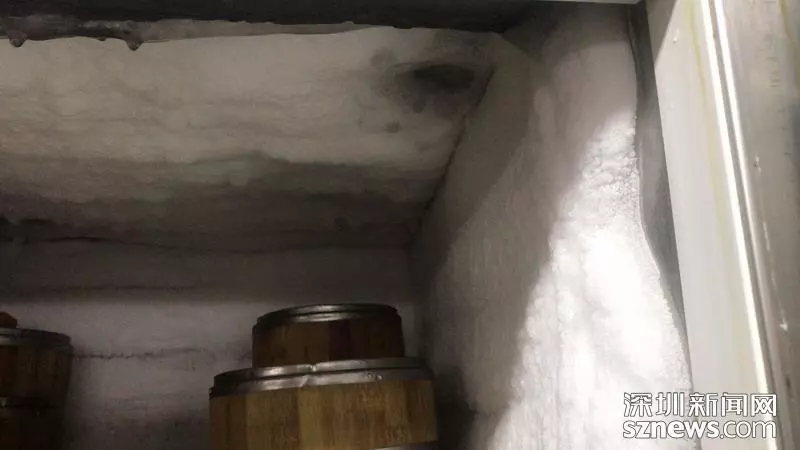 盛放菜品的冷柜除霜不徹底。