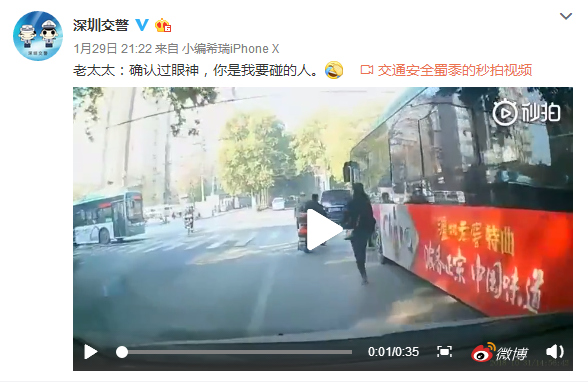 深圳zaker2019年1月31日訊 1月29日,深圳交警微博發(fā)布了一段視頻,并配文"老太太:確認(rèn)過(guò)眼神,你是我要碰的人。"