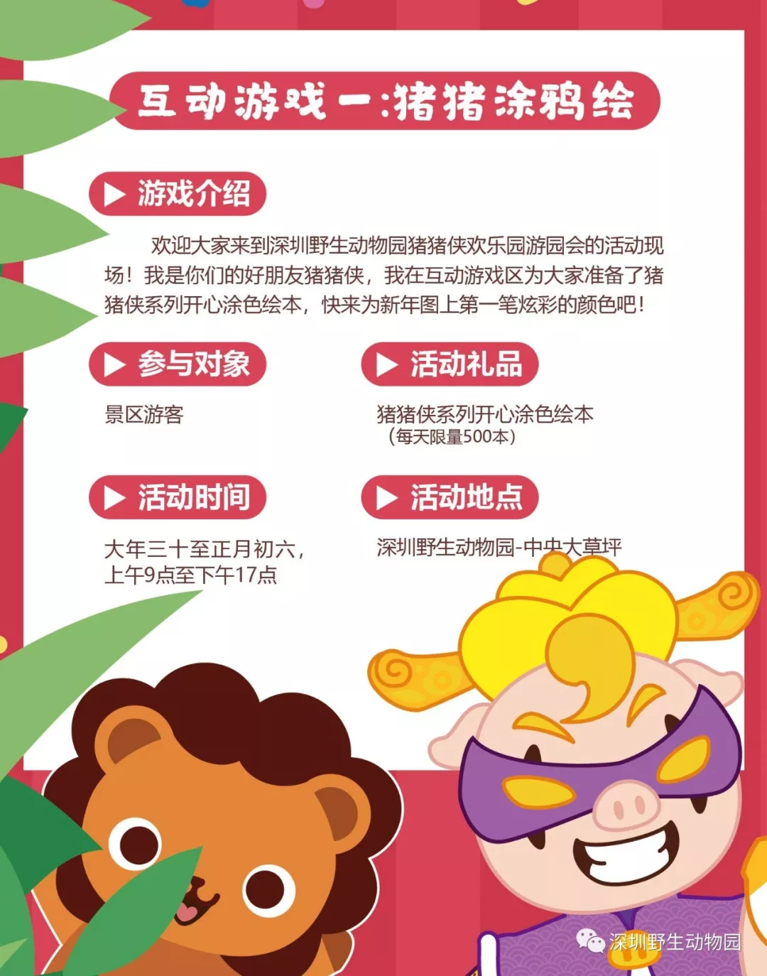 深圳野生動物園攜手豬豬俠、攜程網(wǎng)重磅推出“豬豬俠歡樂游園會”大型系列主題活動。豬豬俠率領小伙伴們空降深圳野生動物園,大鬧動物王國開啟多重活動,精彩不停!